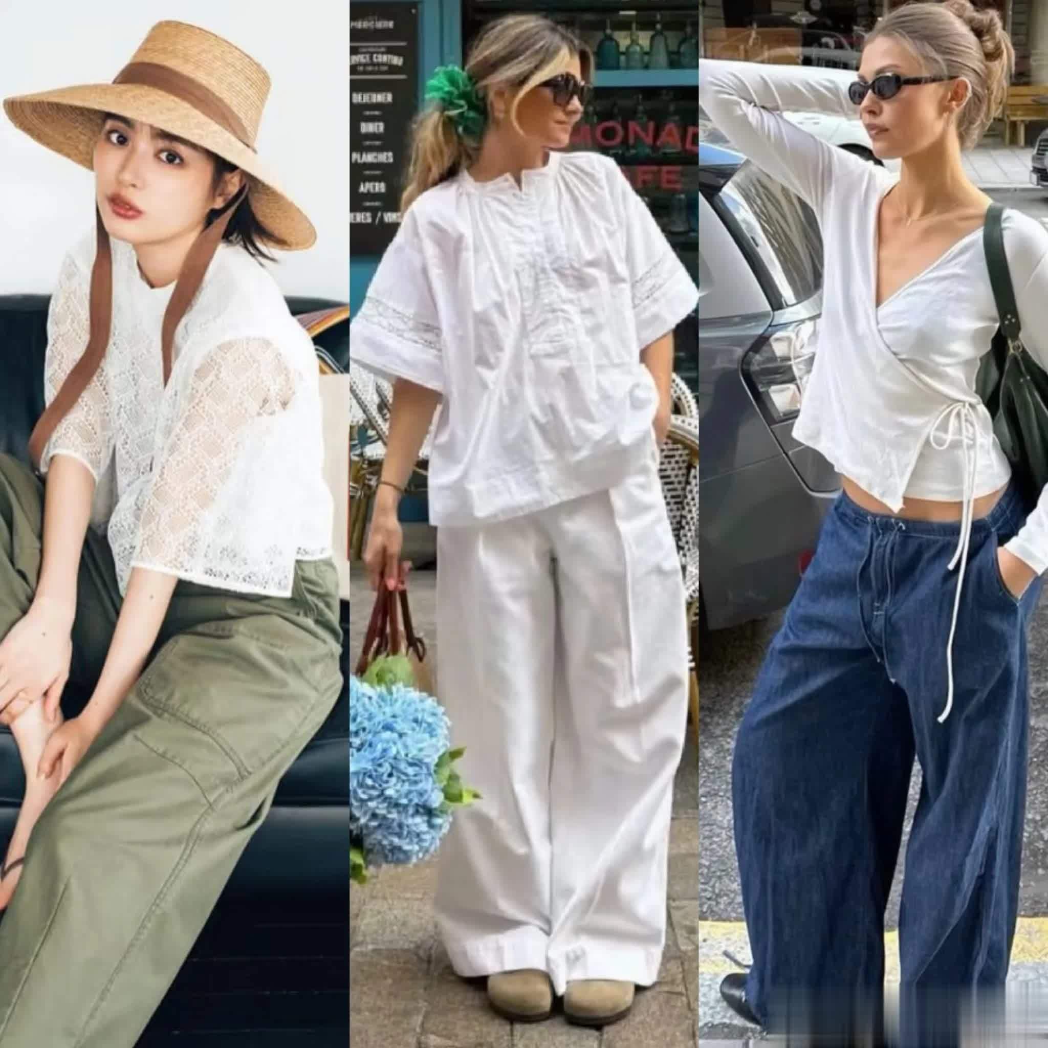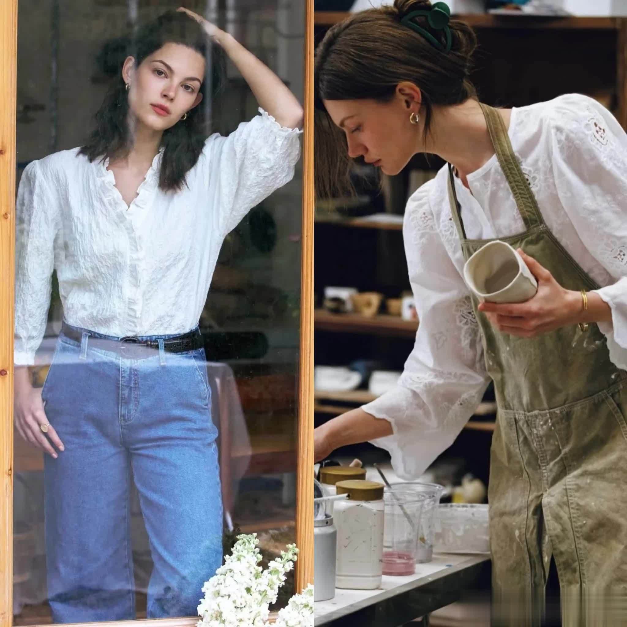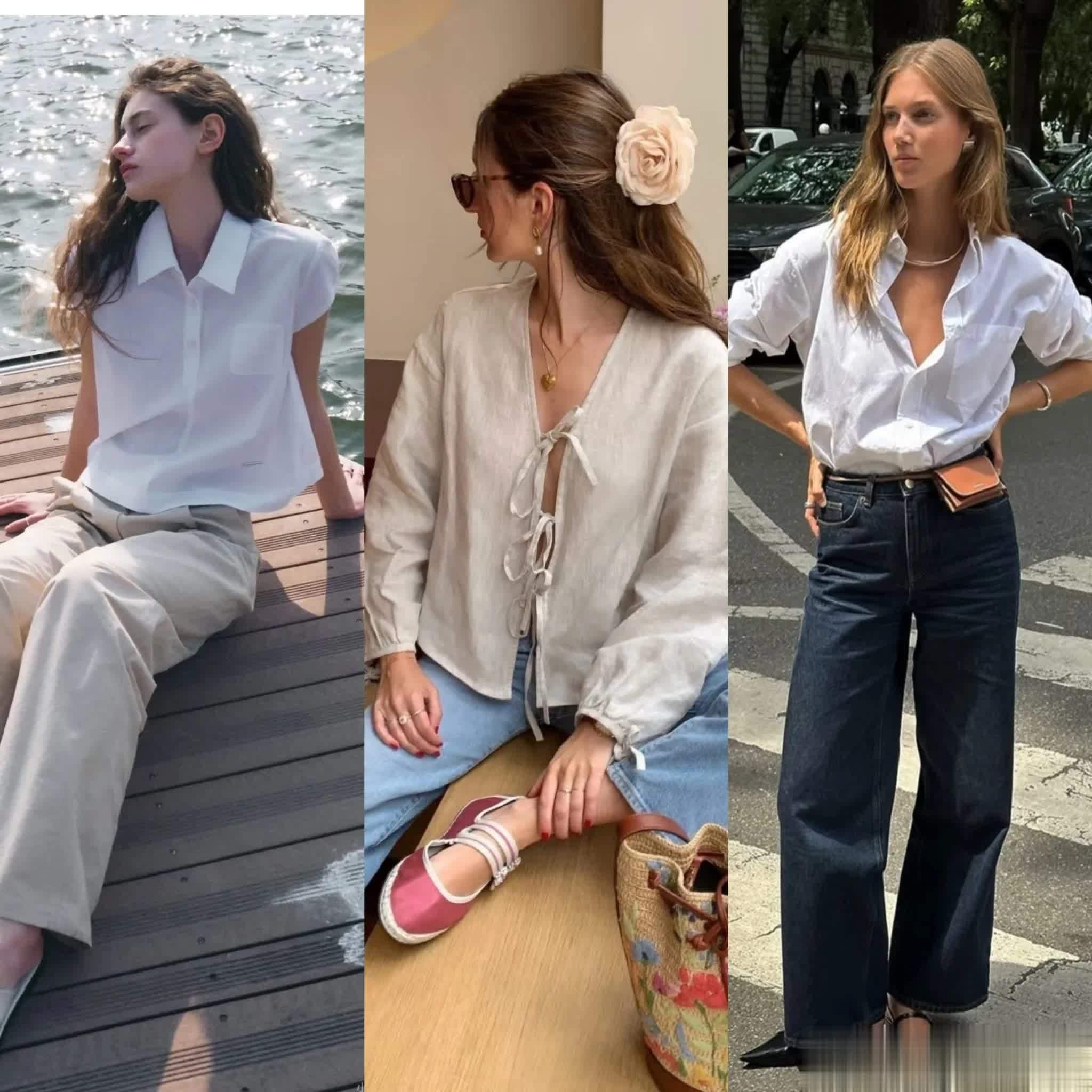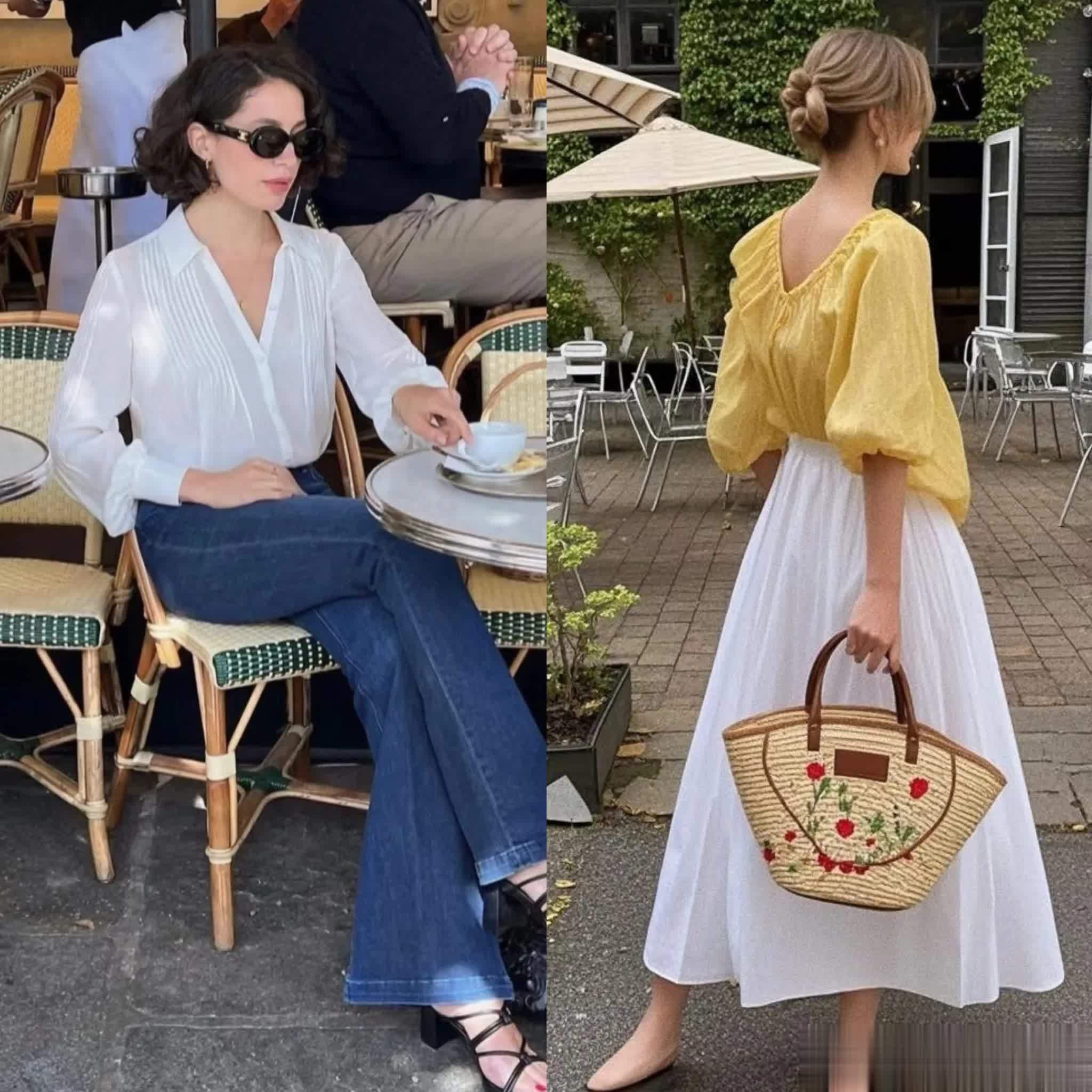 法式风格中,夏季出镜率最高的单品是法式小衫,区别于刻板的白色衬衫,它多了一些小巧的设计,比如木耳边、镂空刺绣、泡泡袖等,给人一种既清新又浪漫的氛围,又带着些小慵懒。