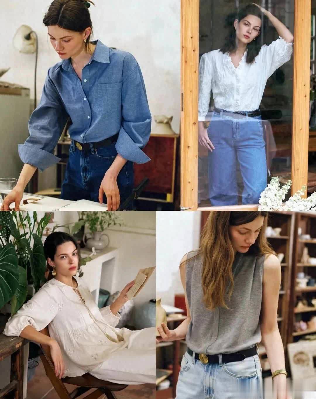 法式风看似随意,却处处藏着细节,比如凌乱蓬松的卷发,剪裁利落的白衬衫搭配牛仔裤,干净的裸妆感与野生眉,都给人一种自然慵懒的氛围。