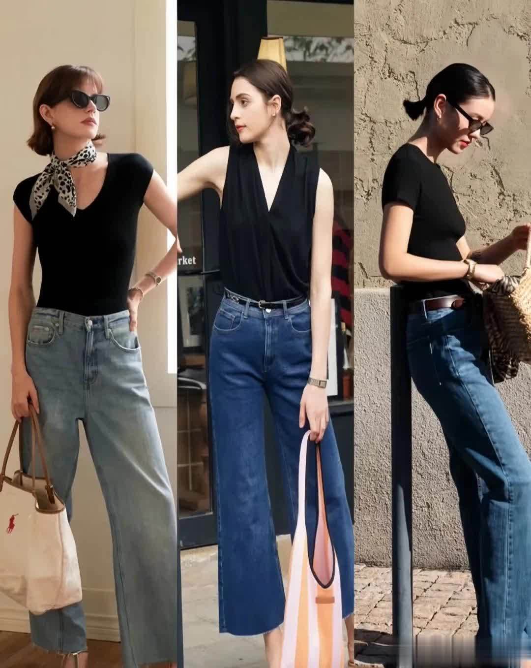 黑色背心搭配藏蓝色的牛仔阔腿裤,随性自然的休闲风格,不用费力就可以穿出时髦范儿来,特别适合夏天。